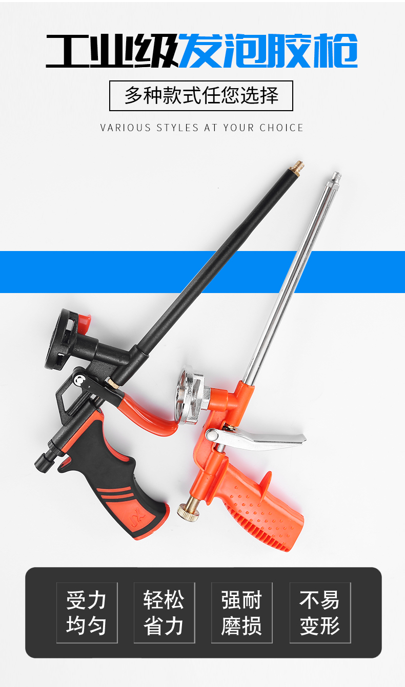 The outline of this gun is very special and impulsive. The materals combination of Aluminum and TPR:neither feels cold like metal,nor looks as cheap as plastic. Its shape conforms to ergonomics.With TPR material,users will feel more comfortable during operating. The stressless adjusting screw with damping brings users easy adjusting and better feeling. All teflon coated,non-stick pu foam ,looks more exquisite.